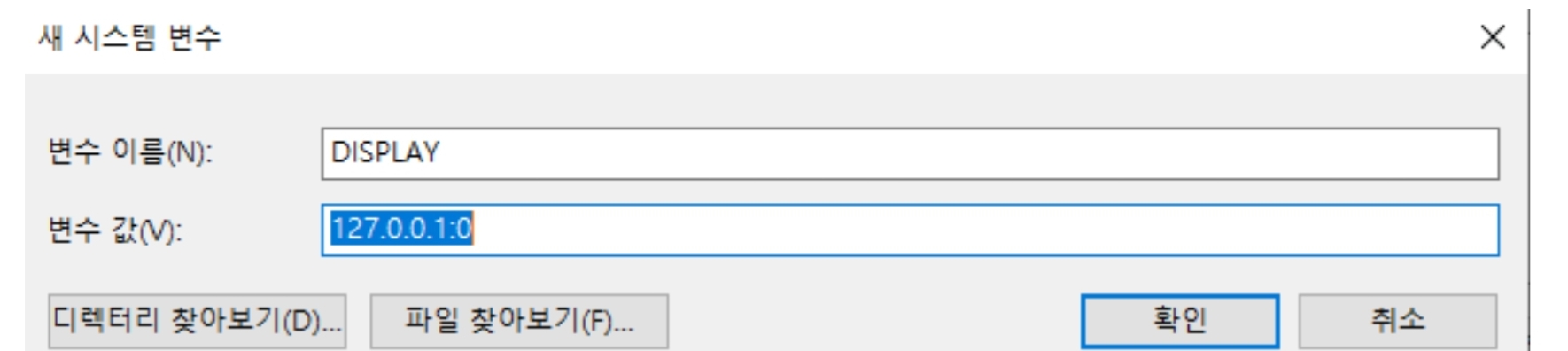 SSH -X를 통해 접속을해봐도 자동으로 DISPLAY번호가 발생하지 않아서 왜그런가 찾아봤더니 윈도우 환경변수에 DISPLAY가 추가되어있어야 한다고 한다. 다음과 같이 추가한다